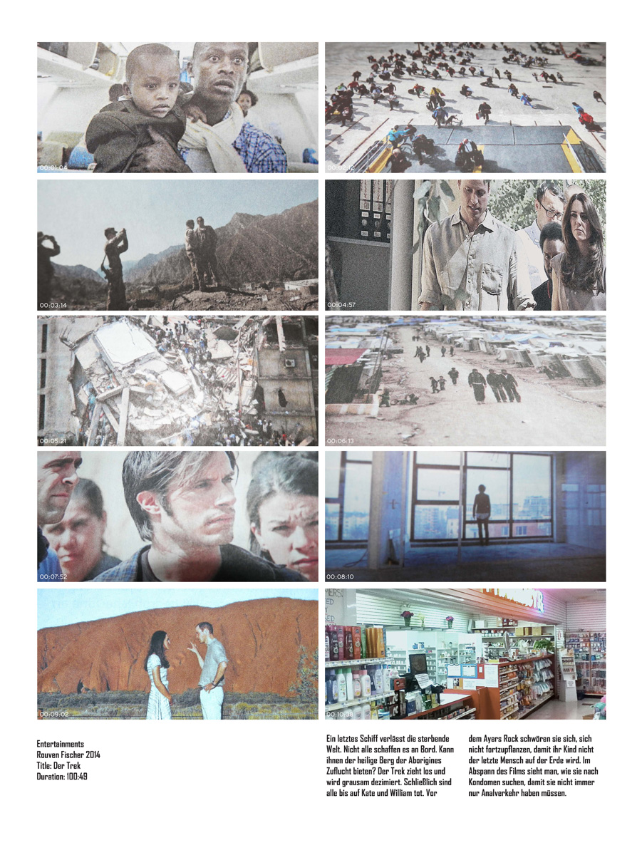 DieFotos entstammen offenbar keinem realen Film, sondern einem medialen Recycling. Es sind abfotografierte Bilder aus Zeitungen und Zeitschriften, manchmal aus einem anderen Film oder einem Buch, es sind Zeichen die aus ihrem Zusammenhang gelöst und neu arrangiert wurden. Dabei bleiben mitunter Reste ihrer ursprünglichen Bedeutung an ihnen haften, wiez.B. in „Der Trek“, wo William und Kate fernab von Windsor ihre ganz eigenen Regeln für das Überlegen in der Apokalypse aushandeln.