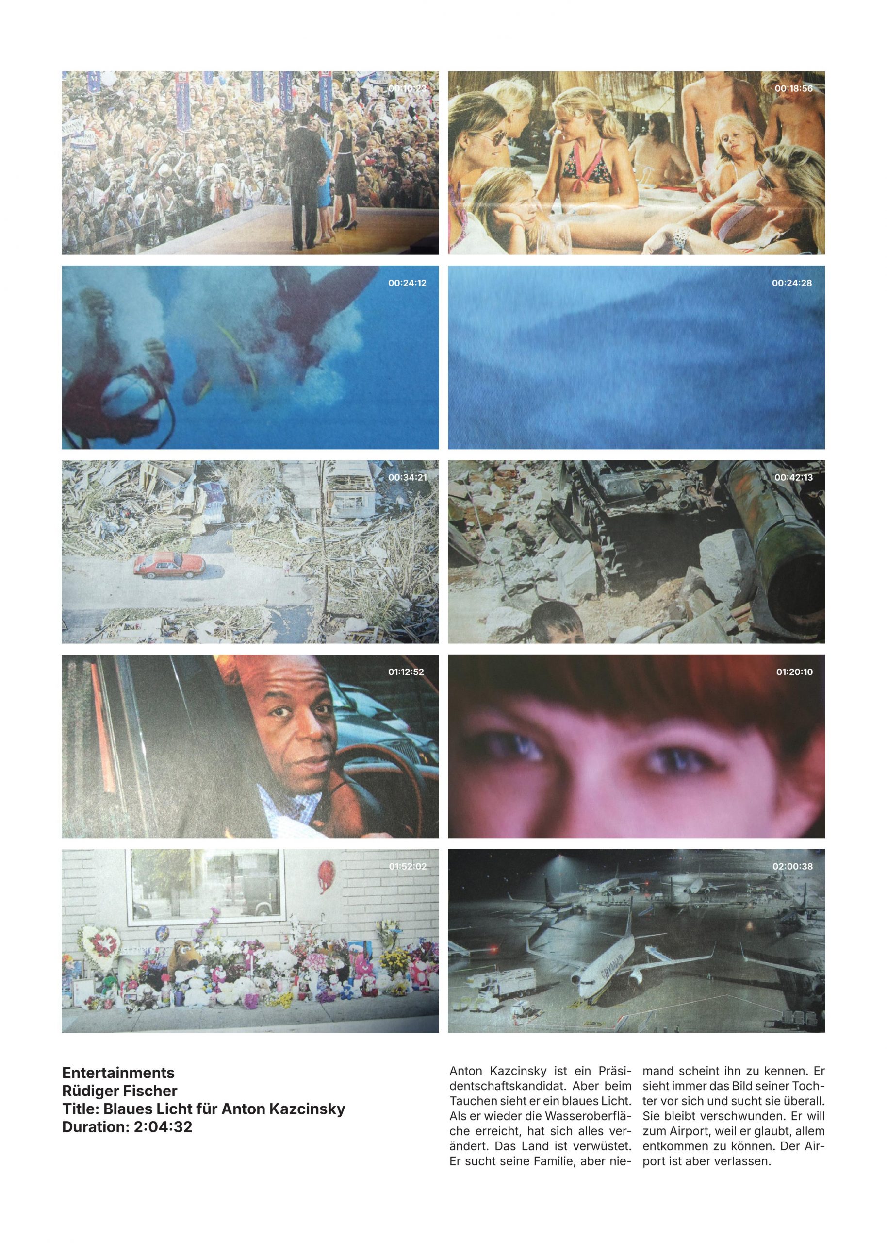 Alle diese Mashups erzählen eine dystopische (anti-utopische) Geschichte. Auch der Begriff der Entertainments ist einer dystopischen Erzählung entliehen: David Foster Wallace’ „Unendlicher Spaß“, in welcher der Underground-Regisseur James O. Incandenza und seine „Entertainments“ eine zentrale Rolle spielen. Meine Entertainments orientieren sich an den Archetypen des fantastischen Kinos. Wir erkennen diese Strukturen sofort: Der Weltuntergang, die geheime Organisation, die Flucht vor einer Bedrohung, der Kampf gegen fremde Mächte.
